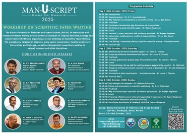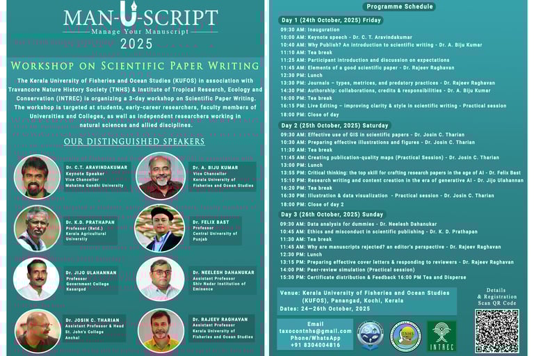 The Kerala University of Fisheries and Ocean Studies (KUFOS) in association with Travancore Nature History Society (TNHS) & Institute of Tropical Research, Ecology and Conservation (INTREC) is organizing a 3-day workshop on Scientific Paper Writing.