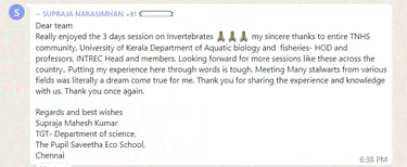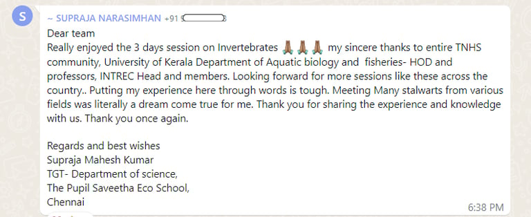 "Dear Team, Really enjoyed the 3 days session on Invertebrates. My sincere thanks to entire TNHS community, University of Kerala Department of Aquatic biology and fisheries- HOD and professors, INTREC Head and members. Looking forward for more sessions like these across the country. Putting my experience here through words is tough. Meeting many stalwarts from various fields was literally a dream come true for me. Thank you for sharing the experience and knowledge with us."